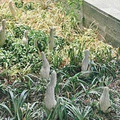2025年春季,加里波第受邀在余德耀美术馆户外及蟠龙天地社区呈现公共艺术项目「融合之地」(Lartucira Field)。基于对在地文化、生态环境与社区建设的持续思考,艺术家创造了一系列白色石膏雕塑「融合雕塑」(Lartucira Kloumir),并与社区参与者共同完成特定场域壁画「融合壁画」(Lartucira Komper)。灵芝、平菇等本地菌种在艺术家雕琢的石膏雕塑体内随时间悄然生长变化,形成动态的肌理。
