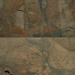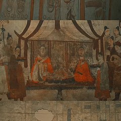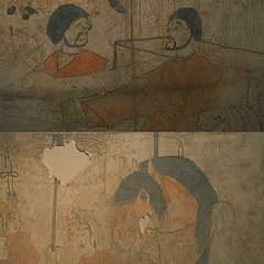 北齐娄睿墓位于山西省太原市晋祠王郭村,墓主人娄睿为鲜卑人,是武明皇后娄昭君的侄子。墓室壁画描绘墓主人死后飞升的空幻境界,包括天空星象、祥瑞、神怪异兽、夫妇宴饮场景等;墓道壁画则勾勒墓主生前的显赫生活场面,如鞍马游骑、军乐仪仗和门官仪卫等。