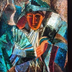 毕加索与法国艺术家罗杰·马莱伯-纳瓦尔(Roger Malherbe-Navarre)的工作室合作,利用组合、层叠和黏贴彩色玻璃片的方式,将其部分代表性画作转化为玻璃画,并配合光线投射重新演绎画作。这些玻璃画以6至7层不同色彩的玻璃片组合而成,在灯光下显得剔透而立体,格外瑰丽迷人。
