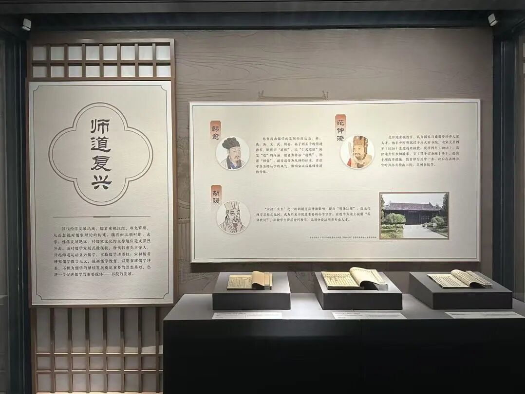 「洙泗之风」单元设四个板块,整体阐释书院四大事业——祠庙祭祀、藏书刻书、讲学课业与制度经济,展现书院教育制度之完备。「传道立学」单元通过时间线梳理不同朝代书院教育理念的发展,展现一代代「书院人」砥砺学问的教育精神,呈现古代书院学派林立,推动儒学多元化发展。