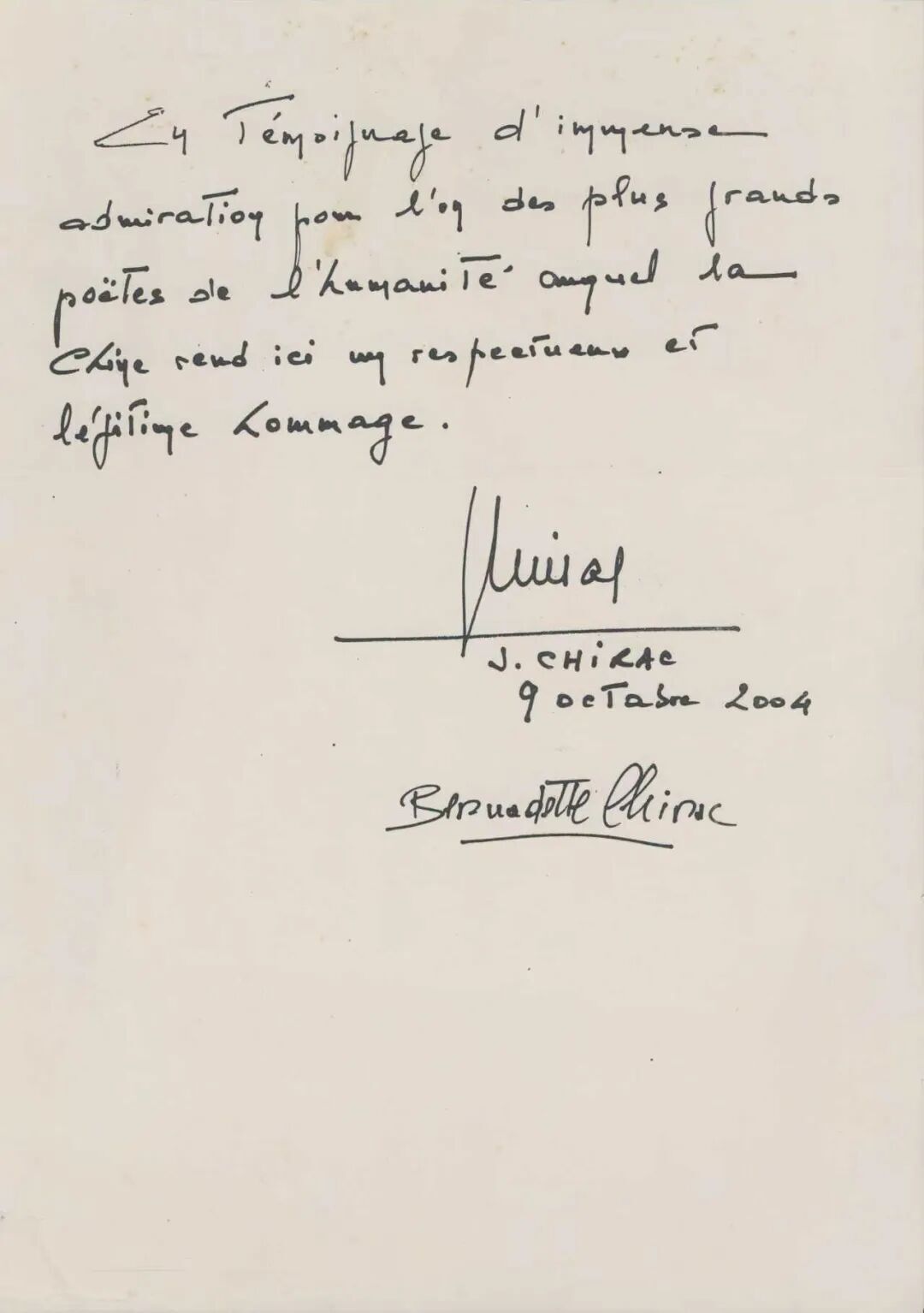 (法国)希拉克题词:「向人类最伟大的诗人致以最崇高的敬意。」