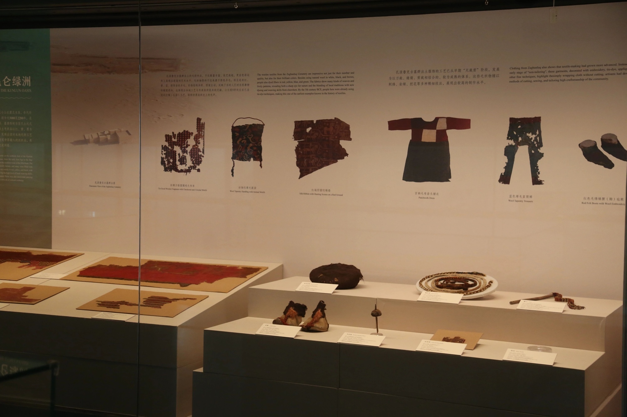 展出文物中,出土自小河墓地、扎滚鲁克古墓群的毛纺织品年代早、类型多、保存完好,是新疆早期文明的代表,也是研究世界毛纺织文化重要的实物资料;出土自楼兰墓群、营盘墓地的丝织品规格高、品类多、色泽鲜艳,对于研究丝绸之路贸易、交通、中西文化交流都有着重要的学术价值。