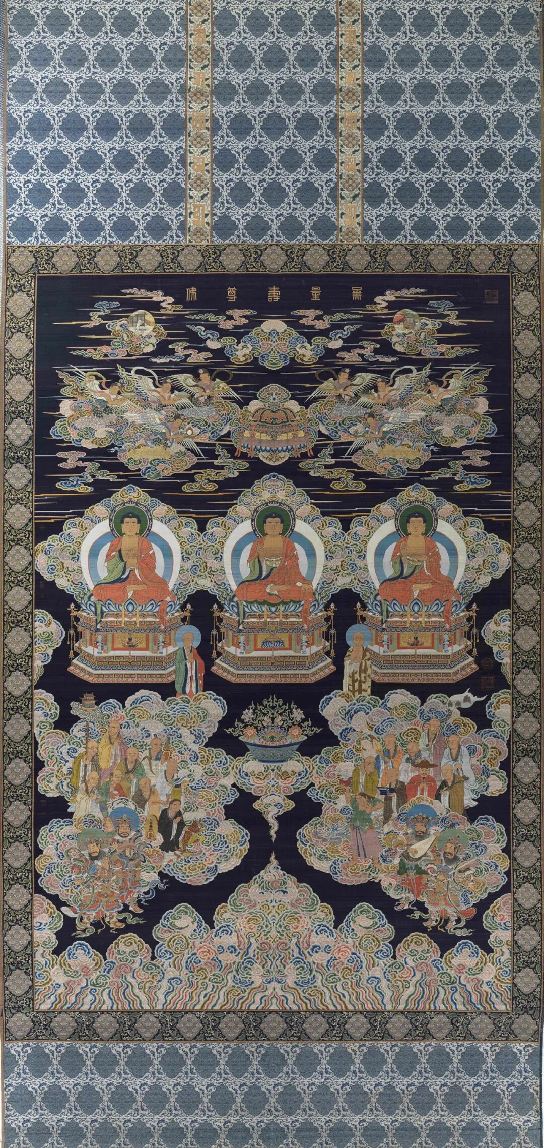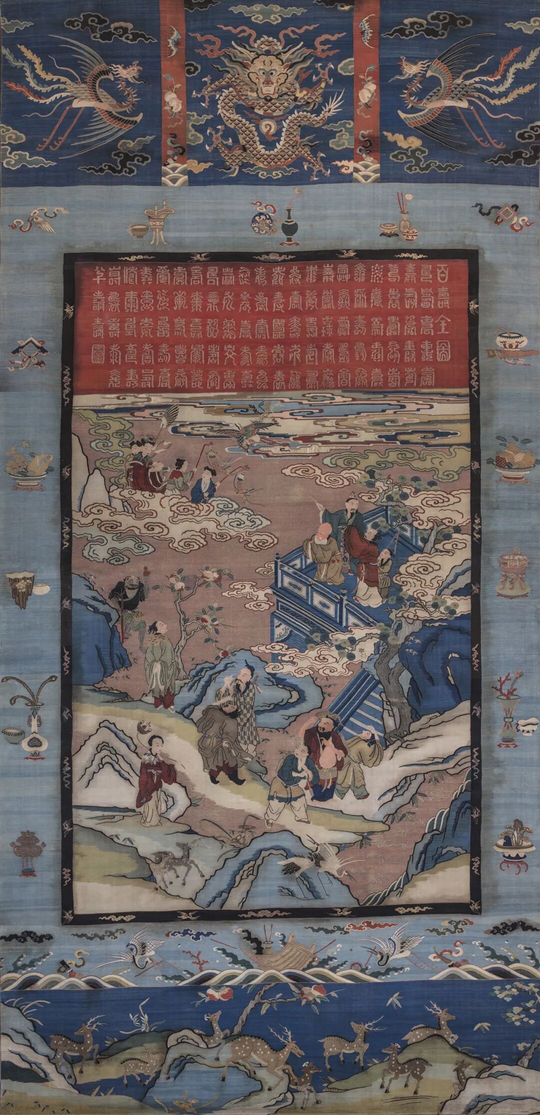 「灵山瑞像」单元呈现馆藏仙释人物题材织绣书画,涵盖群仙集庆、麻姑献寿、魁星点斗、三世佛等经典主题,展现人们对国泰民安、长寿无极、学业有成、仕途畅达的美好祈愿。