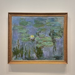 莫奈去世后的次年即1927年,艺术家捐赠给法国政府的这套画作最终在橘园美术馆的「睡莲」展区面向公众展出。促成画作展出的克列孟梭在这些画面中看到了一个「颠倒的世界」,这是一个由阴影和光线组成的、水上漂浮的世界,睡莲与树木、云朵的倒影在水面上交织融合,营造出一种宁静梦幻的氛围。