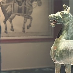 展览中,观众可欣赏与「马踏飞燕」同出于武威雷台汉墓的青铜车马,感受汉代车骑仪仗的赫赫威仪;欣赏凌空踏云的玉仙人奔马,品味汉代玉雕中的灵动神韵;近观出自吐谷浑墓葬的唐代骑马击鼓俑,领略丝路交往的生动瞬间;在徐悲鸿《饮马图》与张大千《临曹霸玉花骢图》中,体会墨韵流淌中的马魂风骨。