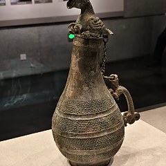 本次展出的青铜匏壶即出土于赵卿墓。此壶高40.8厘米,最大腹径18.2厘米,壶盖为圆雕的鸷鸟形捉手,鸟喙大张,双目圆睁,全身饰精美的羽翎纹,爪抓两条奋力挣扎的小龙。鸟腹下有子口凸榫,套于壶体母口内。壶颈长而侧倾于一侧,鼓腹上有一虎形,虎口衔一环,有链条与盖鸟尾连接。