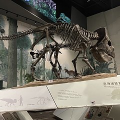 巨型山东龙为本次重点展品之一,1964年发现于山东诸城,是目前已知世界上最大型的鸭嘴类恐龙,其骨骼化石拼装后的复原骨架体长14米,站立高度约8米。