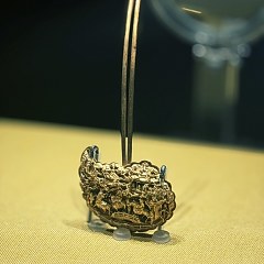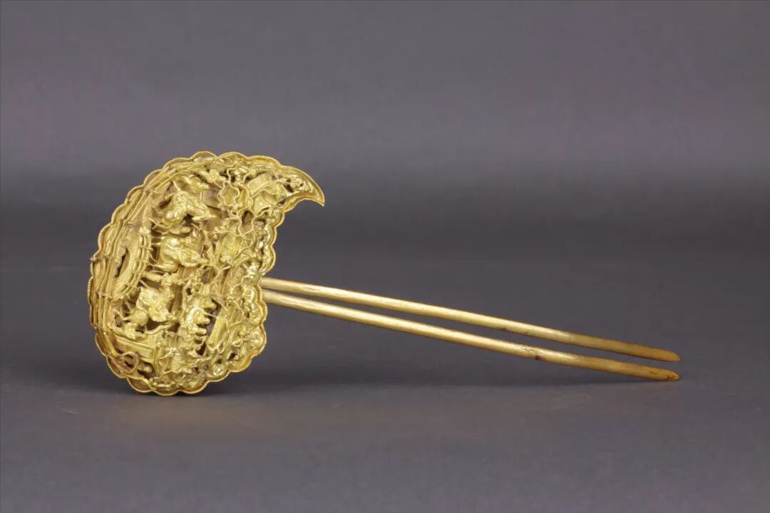 另一件重点展品为一级文物明代云头金钗,钗首呈朵云形,正面雕琢亭台楼阁场景,虹桥、人马、树木、花草清晰可辨,背面刻有七律「三学士诗」和四句颂词,末署「岁在戊申仲冬吉日造」。有学者认为钗首构图源自唐初李世民在秦王府设十八学士的典故。