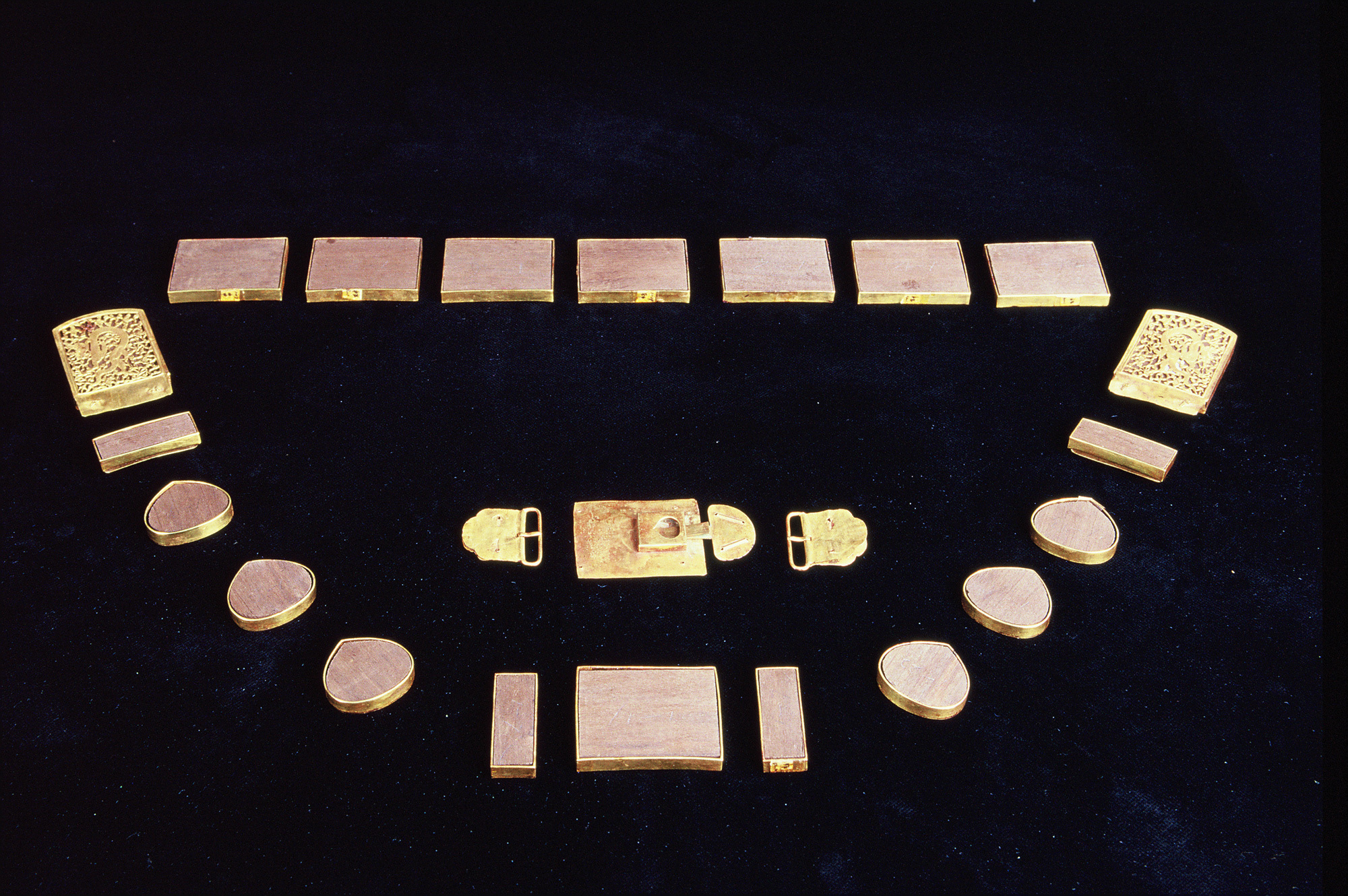 15件展品分别为:镂孔高柄灰陶豆、兽面纹十字孔青铜觚、凤纹方罍、「鲁之造戈」铭文青铜戈、青铜权、「赵濯」铭文青铜弩机、彩陶长颈陶壶、青釉莲瓣纹瓷尊、乐伎陶俑、鎏金铜立佛、湖泗窑青釉瓜棱执壶、金带饰、武昌古城城墙砖、《江汉揽胜图》、张之洞「行书七言诗条屏」。
