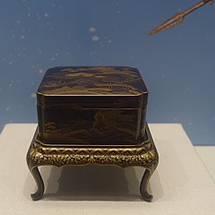 这件器物是乾隆时期的陈设品,表面覆满葫芦枝叶,镶嵌白玉、黄玉葫芦,以及五瓣红珊瑚珠制作的葫芦花若干,再以錾胎工艺表面去除多余部分,制成花叶、藤蔓、小葫芦,叶片内填以绿、黄、蓝、白等各色珐琅釉。