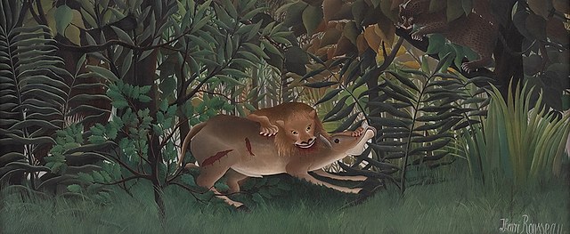 《饥饿的狮子正在撕咬羚羊》(Le lion, ayant faim, se jette sur l'antilope),Henri Rousseau,1989年 - 1905年