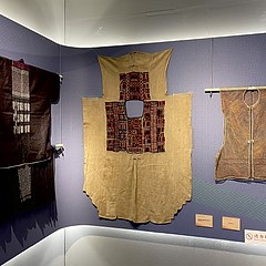 最特别的展品包括一组以特殊材质制成的民族服饰。例如赫哲族是以渔猎为生的民族,其传统服饰鱼皮衣就是用乌苏里江野生鱼的皮作为主料及边饰,以鱼鳔为胶,动物的筋腱为线制成的特殊服装;广西三江县苗族女性的夏凉衣截取鸭毛根部的细管缝制而成,既通风、防汗,又美观、便捷。