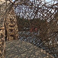 「庇护所」是台北市立美术馆室内展厅暂停开放期间举办户外活动的平台,也为观者提供休息空间。装置分为两阶段进行,第一阶段编织穹顶与廊道结构,第二阶段于10月中旬开始,沿美术馆建筑主体外墙向上搭建一座瞭望台,预计12月全部完成由穹顶与瞭望台两大结构体组成的户外编织装置。