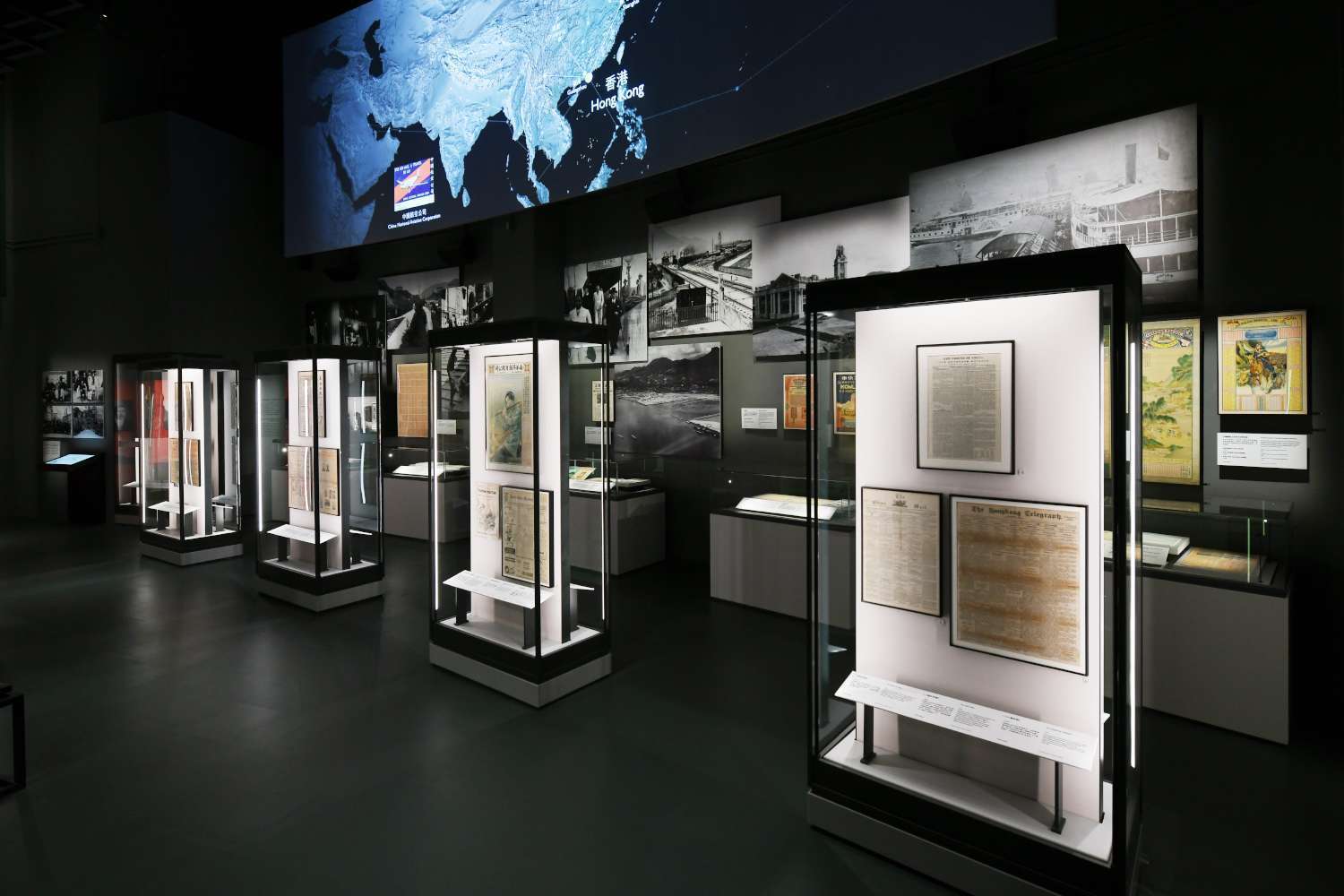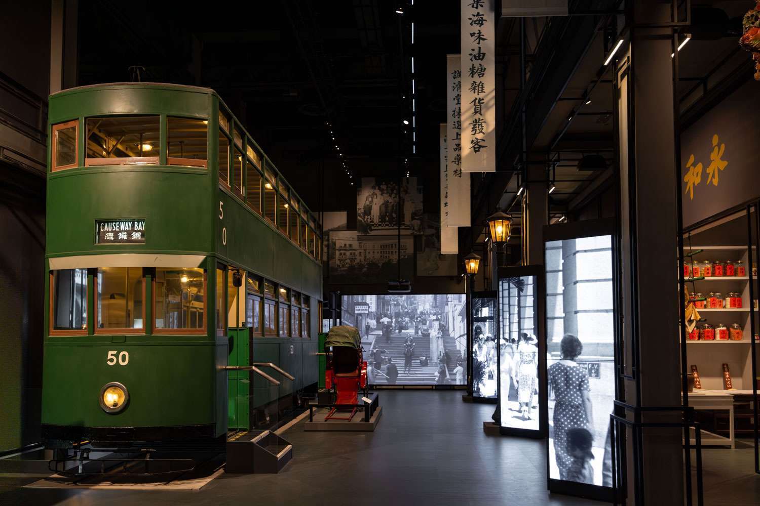 「历史变迁」展区邀请参观者伫立于林则徐像与1899年中英勘界石碑前,感受鸦片战争与不平等条约留下的时代沧桑。「摩登都市」展区展示香港在华洋互动中形成的独特社会面貌,重点展品包括香港首家发钞银行东藩汇理银行1860年发行的钞票以及由孙中山亲自下令创办的《中国日报》。「华洋融合」展区还原1930年代大街场景,如双层电车、唐楼、实景布置的诚济堂中药店等。