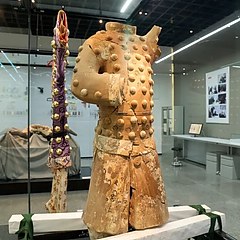 本展最值得关注的展品为K9901陪葬坑出土的4号百戏俑。这件百戏俑身上遍布彩绘:颈部为黄色底上装饰菱形方格纹;手肘上有泡钉及白底三角形、树叶纹等;胸部及上半身装饰泡钉,泡钉之间有八角太阳纹;腰上宽带上装饰树叶纹、旗杆纹等;短裙上装饰变形夔龙、变形夔凤等,两腿之间有戳印的「宫臧」(即官方制造)字。
