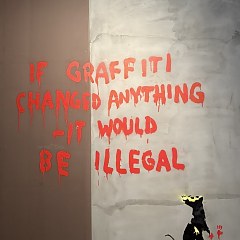 班克斯是当代最具影响力的涂鸦艺术家之一,其真实身份迄今未知。他的街头涂鸦作品多采用模板拓印的方式,题材涉及气候危机、反消费主义、儿童福利、动物权利等社会议题。