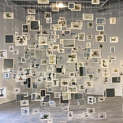 她在画作中描绘了植物相互层叠的场景,加上笔墨的流淌和印记,形成类似花卉之云的形象。在装置中则用刺绣绣出每一株植物并将其装裱,从天花板上垂吊下来,植物在空中悬浮,如同云彩。这些植物写生研习将在展览中展出。