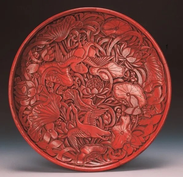 剔红荷塘双鸳纹圆盘,明代,辽宁省博物馆藏
