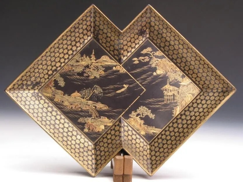 黑漆描金彩绘山水纹方胜式盘,清代,沈阳故宫博物院藏