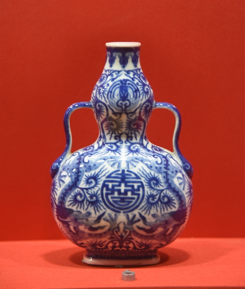 青花双龙捧寿绶带耳葫芦瓶,清乾隆