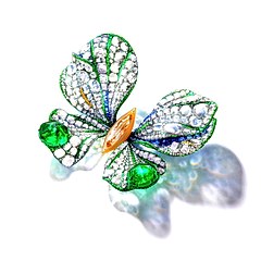 这件作品使用钛金属制作,蝶身为一颗8.31克拉马眼形浅棕色钻石,双翼各镶嵌一颗糖塔形哥伦比亚祖母绿,总重达56.7克拉。蝶翅主体采用多种形状的玫瑰式切割白钻,创造出蝴蝶翅膀向外舒展的视觉效果,多层次镶嵌工艺让参观者可以透过表层的钻石看到下层的蓝宝石。这件作品还首次运用牛角材质,经过打磨后的牛角呈现透光质感,展现出原始质朴的天然质地,完美复原蝴蝶身体的有机生命力。