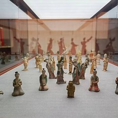 灰陶彩绘乐舞俑,唐代,郑州大象陶瓷博物馆藏