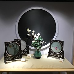重要展品是彭世平的《文君熊猫》,曾获得1989年世博会金奖。三异绣的意思是异形、异色、异法,在同一块绣布的两面用不同颜色、不同针法绣制出不同的图案。作品的一面再现了凤求凰的场景,司马相如正在为文君弹琴,另一面描绘了一对大熊猫在玩耍。
