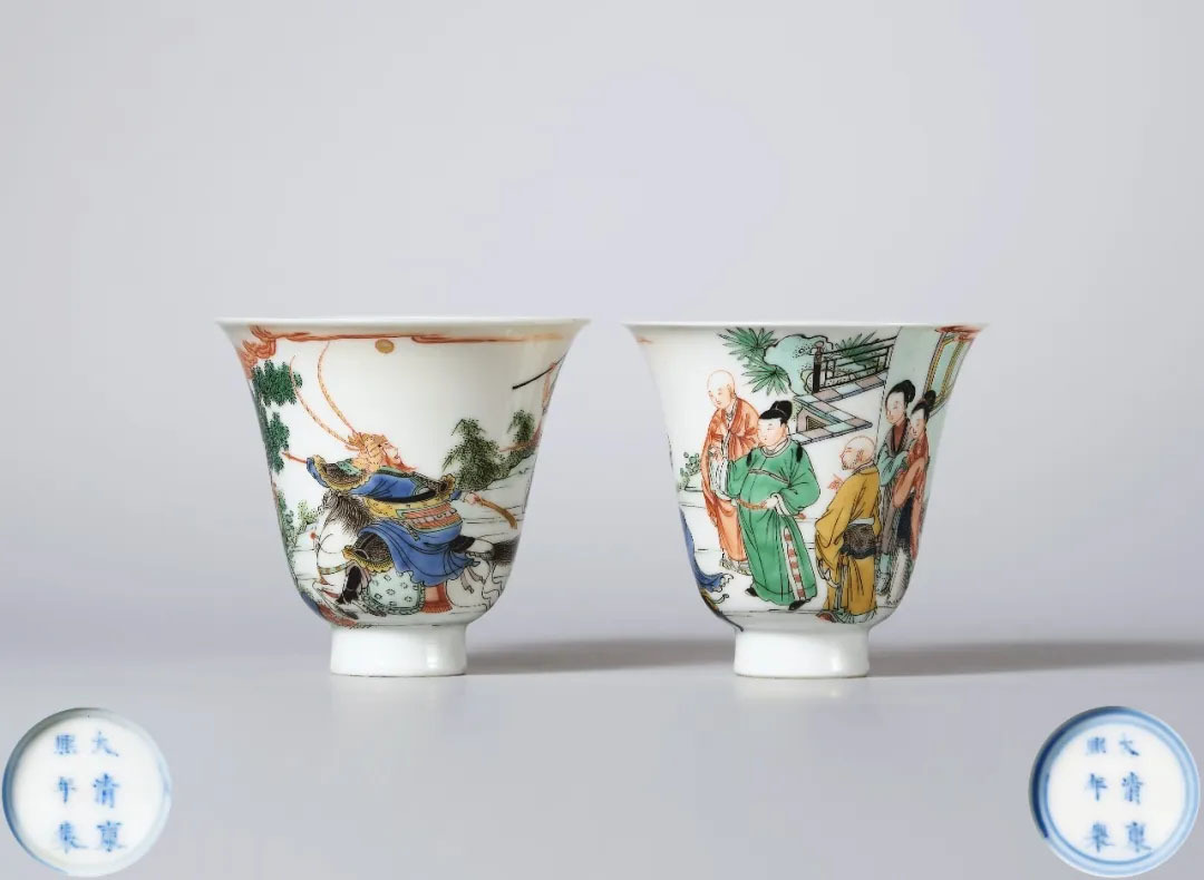 五彩西厢记人物故事图仰钟杯一对,清康熙