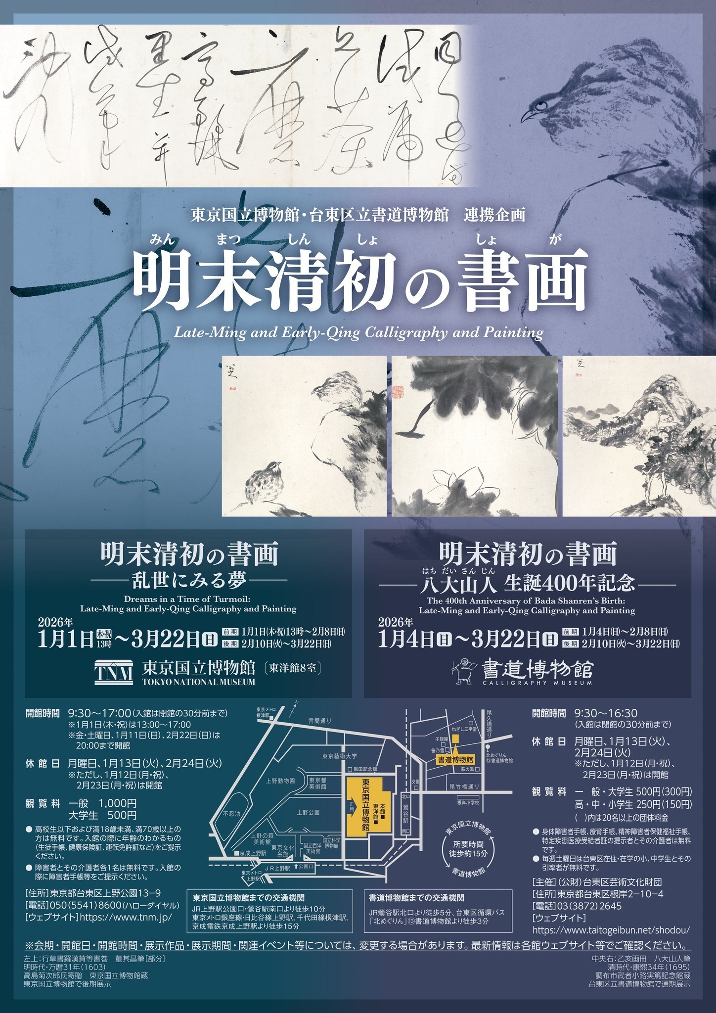 「明末清初的书画」是东京国立博物馆和台东区书道博物馆联合策划的第23期专题展,呈现明末清初这一动荡时期所创造的多样书画面貌。书道博物馆展出的重要作品包括张瑞图《行书后赤壁赋》、黄道周《山水图》、石涛《东坡时序诗意图册》等。