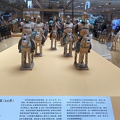 上海博物馆馆藏一套明代彩色釉仪仗俑队,共计66件,气势恢宏、栩栩如生。仪仗俑队的排列有较严格的安排,4名骑马武士开道,紧接着是吹鼓手、文俑和乐俑,之后是8名轿夫抬大轿,众多陶俑簇拥着小轿和交椅,队伍的最后是大床、屏风、烛台等生活用具。
