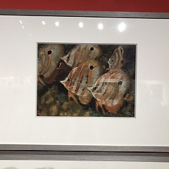 他独创水染技法,整幅画面不用粉色点缀,依靠对水分与色泽的掌握,将游动中的热带鱼和观赏鱼描绘得栩栩如生,趣味十足。此次将展出他的《黄斑鱼》、《如鱼得水》、《渔火》、《族群》、《鱼水情》等作品。