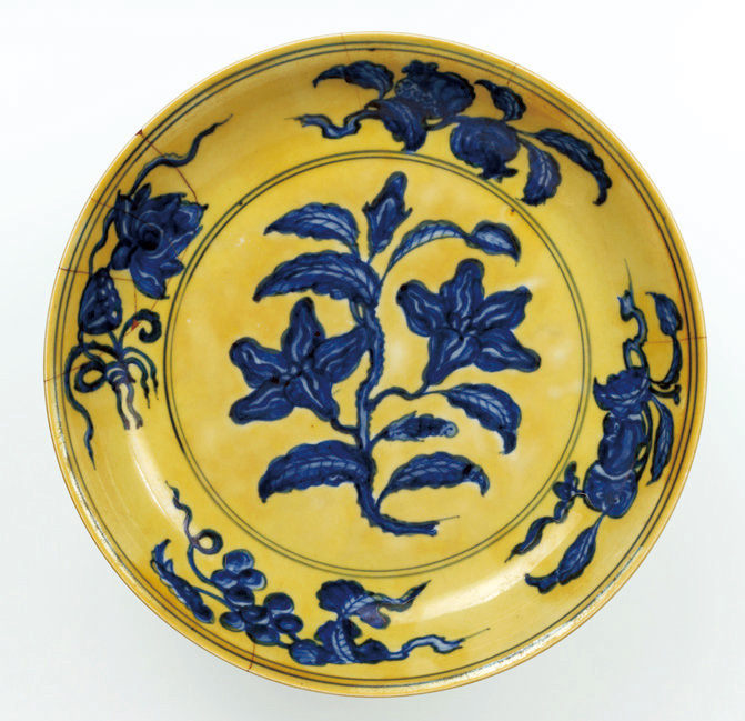 黄地青花折枝花果纹盘,中国,景德镇窑,明代