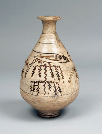 粉青铁绘柳鸟纹瓶,朝鲜半岛,朝鲜时代