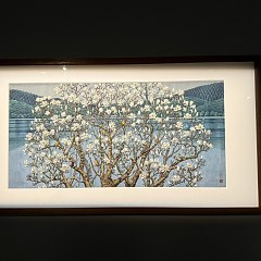 「生命时序」以《玉兰花开》为序曲,引领观者步入祝大年以工笔重彩谱写的生命诗篇。祝大年的工笔重彩画在写生提炼的基础上,赋予其对色彩造型意境的追求。《玉兰花开》完成于1976年,在构图上用整株玉兰撑满画面,繁复的玉兰花、枝干与简洁的水面、远山形成画面主基调。
