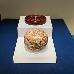 部分玻璃器为首次公开展出,体现了清宫玻璃厂的最高成就。亮点展品包括蓝色玻璃刻螭龙纹嵌宝石松花石砚盒,涅白玻璃珐琅彩百花不露地水丞、涅白玻璃珐琅彩手柄嵌宝配刀等。