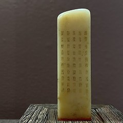 田黄冻石 薄意 篆书诗句「月蟾生彩霞,云福喜朝天」,民国