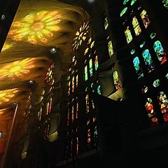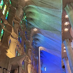 圣家堂是一座拉丁十字式天主教堂,内部设有中殿(Nave)、侧殿(Transept)、后殿(Apse)和地下圣堂(Crypt),建筑运用了大量几何设计元素,例如拱顶与列柱之间的双曲面和抛物面、螺旋状楼梯、椭球形柱头、圆锥曲面屋顶等。