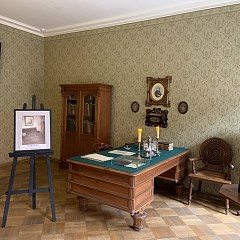 书房是该馆最重要的展区,根据1881年作家去世时的原样布置,书桌上陈列着钢笔、药箱、钱包,角落的写字台上展示着陀思妥耶夫斯基的创作手稿,房间内的时钟定格在20点38分,纪念陀思妥耶夫斯基在这一时刻去世。