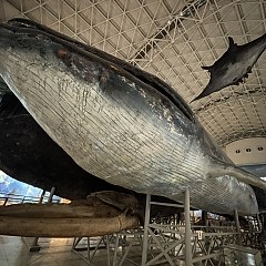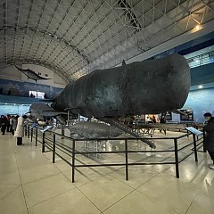 海洋哺乳动物展厅(右图)以海兽奥秘为主题,展出虎鲸、白暨豚、儒艮等标本,参观者还可以在现场听到鲸声,并观看演示鲸回声的定位装置;巨鲸展厅集中展示馆藏巨鲸及骨骼标本,展览亮点包括重66.7吨的黑露脊鲸、重52吨的「潜水冠军」抹香鲸、重34.7吨的长须鲸。