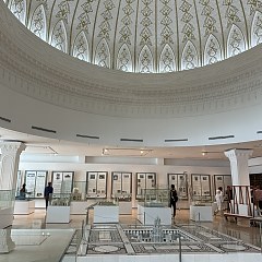 「钱币与印章」展厅通过展示伊斯兰世界的货币流通,回顾王朝的更迭。重要展品有公元7世纪末的倭马亚王朝「第纳尔金币」(Gold dinar)、14世纪的银色环形印章(Silver ring with seal)等。