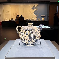 古代瓷器艺术精品展,位于方形展厅四层E2厅:展出了北京出土的瓷器170件,其中重要藏品如青花釉里红海水云龙纹天球瓶、青花凤首扁壶、明成化斗彩葡萄纹杯、洒蓝釉钵等。