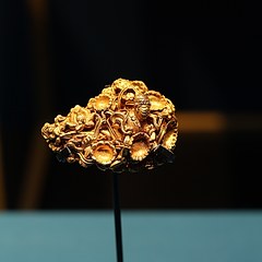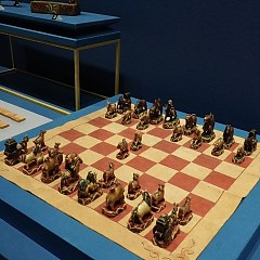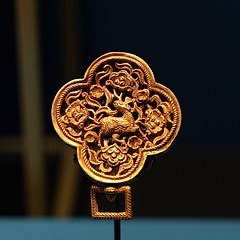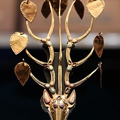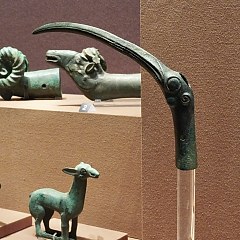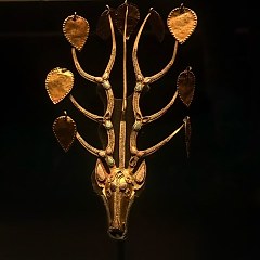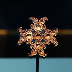 馆内最重要的藏品是一件战国时代的匈奴王金冠,这件文物又名鹰顶金冠饰,冠带浮雕虎、狼、羊、马四种动物图案,顶部装饰黄金及绿松石制成的雄鹰,代表了战国时期北方民族贵金属工艺的最高水平。