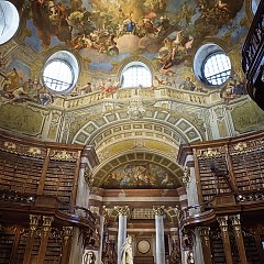 奥地利国家图书馆共有超过740万件藏品及7座场馆。国家礼堂建成于1726年,宽14米、长78米,主要收藏来自哈布斯堡家族的20万册书籍,作品年代从16世纪至19世纪中期。