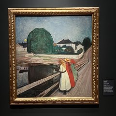 「爱德华·蒙克厅」共展示18件作品,包括《呐喊》《桥上的女孩》《生命之舞》《圣母玛利亚》《生病的孩子》《灰烬》《病室中的死亡》等。