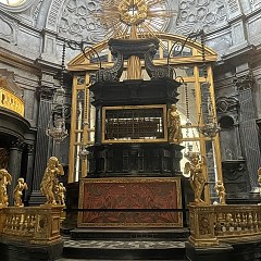 「Daniel 画廊」天顶画,Daniel Seiter,1649-1705年 王宫西翼还建有一座「神圣裹尸布小堂」,这座教堂建成于1694年,最初是作为王室收藏室,后专门用于保存基督教的重要圣物「都灵裹尸布」。这块亚麻材质的布料上印有男性面容及全身反两面的痕迹,据传是包裹耶稣尸体时使用的麻布。1997年,这件圣物被转移至后方的都灵大教堂保存。