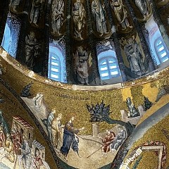 中殿共有3幅镶嵌画,分别是大门上方的「圣母之死」,以及两侧墙壁上的「耶稣基督」和「善导之母」。「善导之母」(Virgin the Hodegetria)是圣母像的常见种类之一,描绘了圣母玛利亚一手怀抱孩童耶稣、一手指向他的场景,含义为「耶稣是人类救赎之源」。