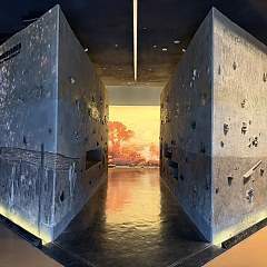 河姆渡遗址博物馆占地面积4.5万平方米,分为博物馆和遗址展示区两部分。博物馆主体建筑造型根据河姆渡7000年前的干栏式建筑风格设计,构筑高于地面的架空层,人字形坡屋面上耸起的5-7组交错构件,象征榫卯木作技术。序厅屋面形似展翅的鲲鹏,代表河姆渡先民的鸟崇拜文化习俗。